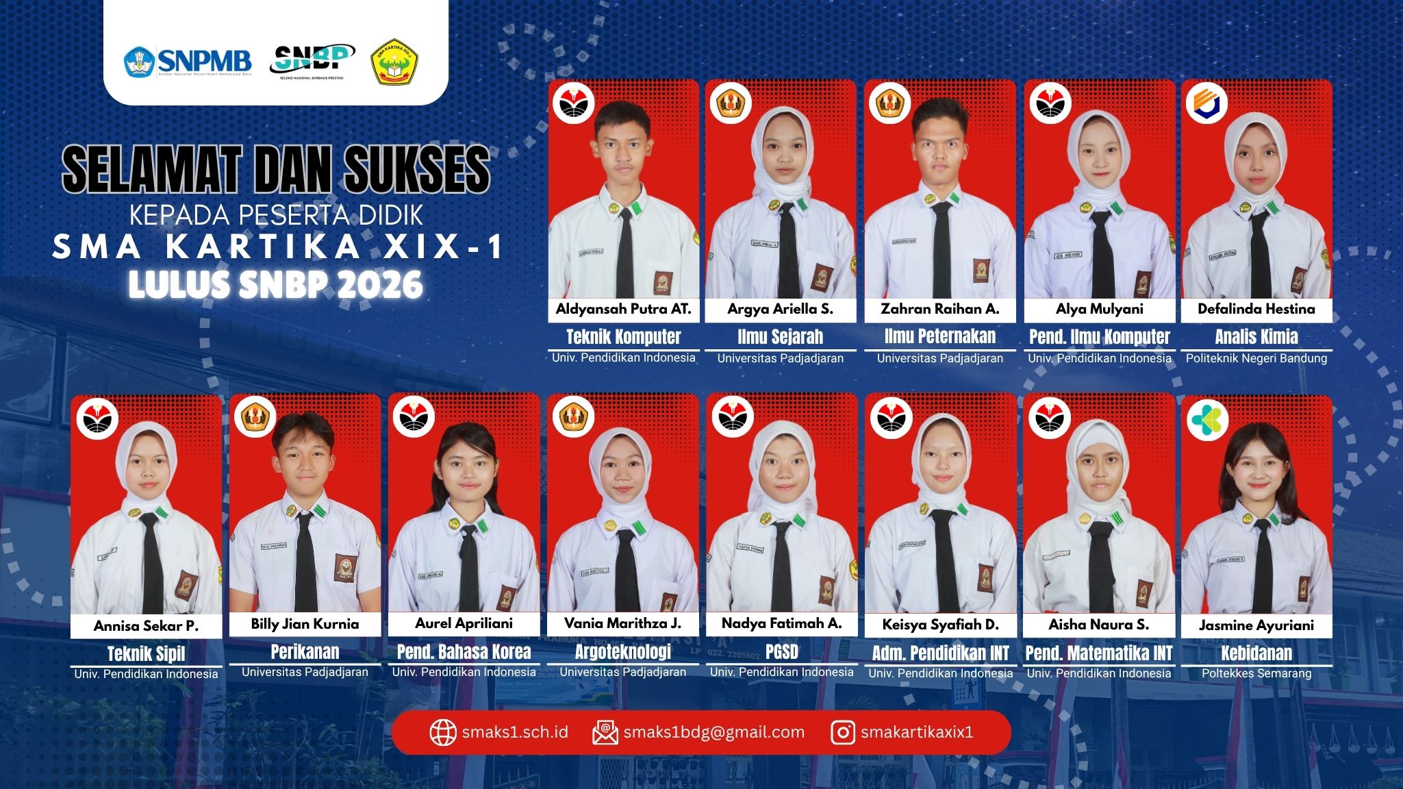 Sangat merasa beruntung dapat belajar di sekolah ini, mendapatkan fasilitas yang sangat lengkap, pengajar berkualitas tinggi dan bisa banyak prestasi yang saya raih dibidang akademik maupun non akademik karena dukungan dari sekolah ini. Saya merasa bangga dan senang bisa menjadi bagian dari civitas SMA Kartika ini. Terimakasih SMA Kartika XIX-1 Bandung. Tetap menjadi yang terbaik!